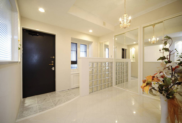 為了讓玄關(guān)看起來更寬敞,所以收納柜全是采用鏡面材料。鏡子也可把視覺空間感增大。整個玄關(guān)處寬敞、明亮。