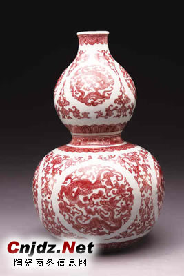 此件釉里紅團(tuán)龍紋葫蘆瓶不僅形制規(guī)整,構(gòu)圖嚴(yán)謹(jǐn),且呈色鮮艷,完美地詮釋了乾隆時(shí)釉里紅名品之樣,從中也可窺見(jiàn)當(dāng)時(shí)制瓷的高超工藝。相同作品的乾隆釉里紅團(tuán)龍紋葫蘆瓶在北京故宮博物院隨安室陳設(shè)著一對(duì);北京藝術(shù)博物館藏有一件。另外,香港蘇富比1990年春拍中曾以319萬(wàn)元成交了一件乾隆釉里紅團(tuán)龍紋葫蘆瓶,與此瓶樣式相同,此外尚未見(jiàn)有其他記載。由此可見(jiàn),此類(lèi)乾隆釉里紅葫蘆瓶傳世者極為罕見(jiàn),而如本次上拍這件之發(fā)色鮮艷者更為難得,實(shí)屬可遇而不可求之官窯精品。 上海裝潢網(wǎng)