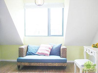 為對(duì)付樓頂?shù)男逼?,設(shè)計(jì)師在坡下面借勢(shì)打一個(gè)衣柜,衣柜的形狀和斜坡正好吻合,藍(lán)色的衣柜不但打破了房間的空曠單調(diào),具備了一定的裝飾效果,它豐富的收納功能更增加了實(shí)用性。設(shè)計(jì)師在陽(yáng)光房斜坡的窗口下放置了一處大小剛好的沙發(fā),由于斜坡的作用使得這里享受陽(yáng)光更充分。由于梳妝臺(tái)對(duì)高度沒有太多要求,所以在房間的另一個(gè)斜坡處擺放了一個(gè)妝臺(tái)和妝凳,將斜坡空間利用到底??b密的設(shè)計(jì)使整個(gè)日光房中的空間沒有浪費(fèi),卻又適當(dāng)留白。