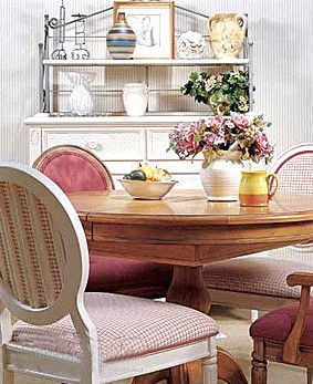 由于不少家庭出于戶(hù)型的考慮,并未特地開(kāi)辟家居餐廳,但卻可以稍費(fèi)心思在客廳的某個(gè)位置標(biāo)新立異,于是一個(gè)特殊的就餐環(huán)境便能在客廳的范圍內(nèi)“渾然天成”。白色櫥柜因?yàn)殍F藝擱架的設(shè)計(jì)變得有些與眾不同,上面可以擺放些物品,集收納、展示于一體。而原木色餐桌與方格布藝餐椅椅墊相互搭配,形成悠閑清爽的地中海風(fēng)格。就餐的心情便像地中海的微風(fēng)迎面吹來(lái)般享受愜意。