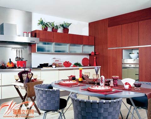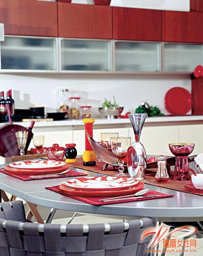 概要: 布置多人就餐空間 橢圓形餐桌+移動置物架+紅色餐具飾品 配有橢圓形餐桌和移動置物架的廚房,可容納多人用餐,是大家庭節(jié)日聚餐的理想場地,雖然餐桌椅的顏色、烹飪區(qū)的不銹鋼金屬顏色有點冷,不過,巧用中國紅就能把這兩處的色彩提亮起來。節(jié)日聚餐,餐桌上自然是中國紅布置的重點,低柜臺面和木質(zhì)置物架上做輔助性烘托、點綴。