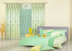 臥室中既然以床為中心了,其它飾物一般就應(yīng)有“退居二線”的襯托意識(shí)。如窗簾,面積較大,太艷、太豪華了,就會(huì)與床飾形成兩個(gè)“中心”,以至讓人眼花繚亂。故窗簾應(yīng)選用相應(yīng)一點(diǎn)兒的色彩、圖案、面料,像一個(gè)“仆人”站在床邊。