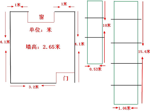 4面墻:4米+4米+窗兩邊1+1+3.1=13.1米(周長(zhǎng)是13.1)高度是2.65米