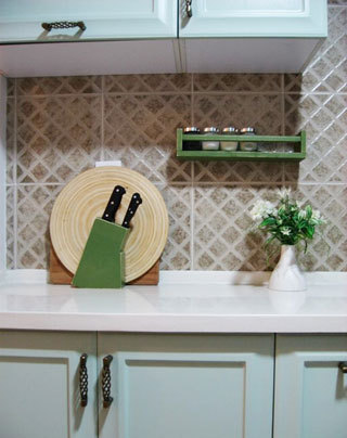 廚房間墻面磚及地面磚用了同一種,遠(yuǎn)遠(yuǎn)看起來以為是馬賽克,很有復(fù)古的感覺。