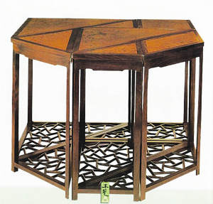 “最難制作的家具是什么?我認(rèn)為七巧桌,它是由七巧板演變而來的?!蓖醪媒榻B說,中國古代智力游戲中最有名的是七巧板,根據(jù)七巧板的原理,可以拼出很多種圖形,那么七巧桌也就同樣能拼出多少樣式。七巧桌有二個(gè)大三角形,二個(gè)小三角形,一個(gè)中三角形,一個(gè)正方形,一個(gè)平行四邊形組成,“可聚可散,可以用各種方式加以變化,七巧桌傳世實(shí)物不多見,蘇州留園有一張紅木、石頭面,我在南通買過一件殘件?!?/FONT>