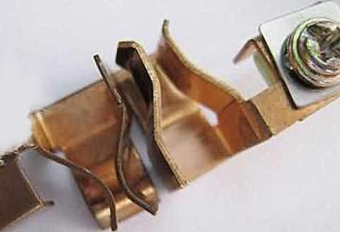 老式的鉚接銅片(明顯的可以看出兩頭材料跟中橋材料完全不一樣,而且有明顯的鉚接點)。一次成型永遠比老式的鉚接銅片好,因為一次成型的銅片永遠比鉚接的電阻小,相對發(fā)熱量也越小,彈性更好,安全系數越高,導電性越高)它的道理跟家里裝修房子線管里的電線是一樣的,一根完整的電線跟打結電線的區(qū)別。