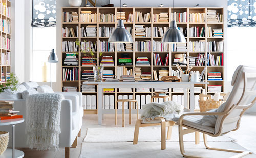 許多小戶型的房子是不會有一個剩余的房間作為書房的,然而對于現(xiàn)在白領(lǐng)來說,沒有書房的空間總想是缺少些韻味。利用客廳有限的空間,將書房融入進(jìn)客廳里。小戶型的客廳并不適合大沙發(fā),小巧的兩座沙發(fā),實(shí)用又溫馨。利用客廳剩余的空間,沿著墻壁,窗戶安置挑高的書架,并在窗邊的書架前放置一個簡單實(shí)用的白色書桌,既不占空間,又實(shí)現(xiàn)了書房的功能。而書房與客廳的聯(lián)合搭配,既實(shí)現(xiàn)了空間的合理利用,又達(dá)到了時尚的感覺。