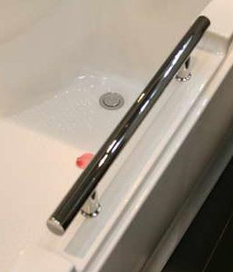 添加扶手也是必不可少的,扶手的材質(zhì)最好也選擇防滑型,一般都為不銹鋼材質(zhì)。這樣老人可以依靠扶手出入浴缸,就更為方便、安全了。在浴室適當(dāng)位置也可以裝個(gè)扶手,以便老人覺得悶熱勞累時(shí)扶持一下。