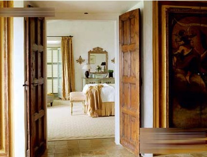 由德國(guó)室內(nèi)設(shè)計(jì)師NonavonHaeften設(shè)計(jì)的西班牙馬略卡(Mallorca)的一間大屋,整間屋的設(shè)計(jì)風(fēng)格和裝飾擁有濃厚的法國(guó)和西班牙風(fēng)味。圖中是主人房門前的一場(chǎng)景。主人房前擺放了不同的古董油畫和藝術(shù)品,看過展覽后一打開門就是舒適的主人睡房,不要以為這一對(duì)厚木門不怎么樣,它本身也是一對(duì)古董西班牙木門,是屋主的展品之一。厚厚的整塊木板和簡(jiǎn)單而堅(jiān)實(shí)的門柄配上幾何圖形的花紋,把藝術(shù)展覽和舒適睡眠之地分隔起來。