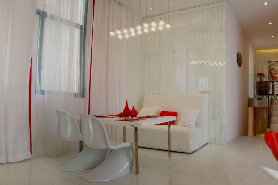 主臥呢,旁邊是飄窗。在紅白的轉換與交叉中游走。