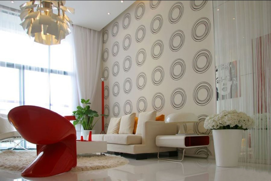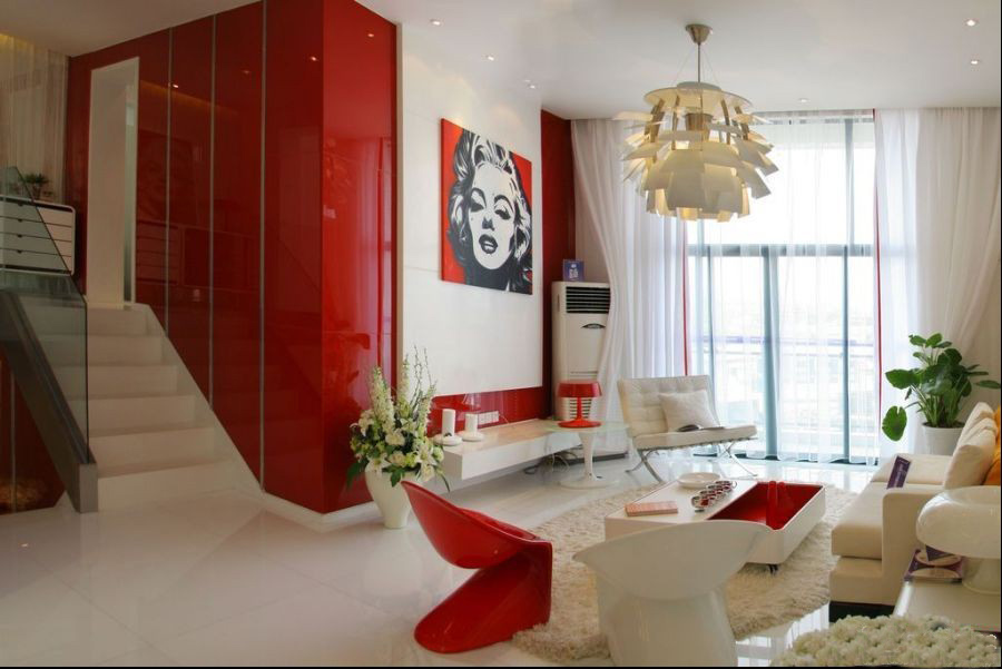 電視背景墻格外搶鏡,紅色、白色和黑色的運用頗有些70年代的感覺。讓整個家的喜慶成份也直線上升,長期居住也不會顯得過時。