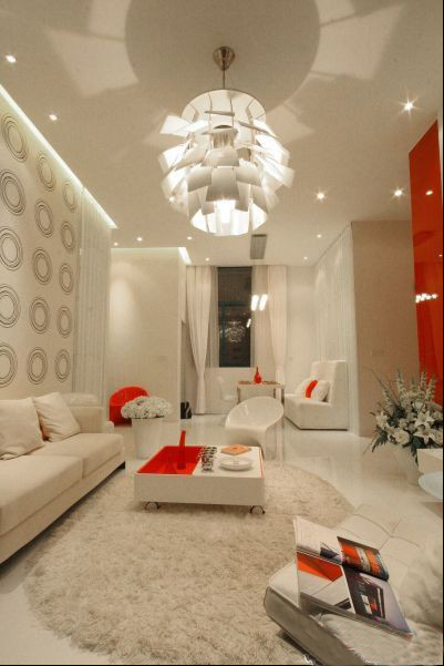 我們從陽臺看客廳全景白色與紅色相間,米色占了很大成份,家的溫馨滿滿的