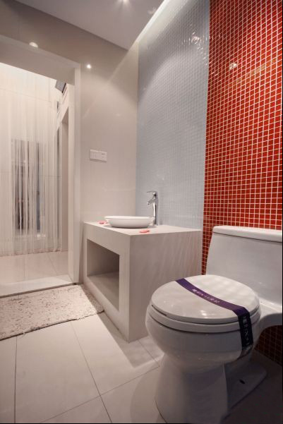 衛(wèi)生間的色彩也出挑,在馬桶的一側做出一些馬賽克拼接,依然是紅色主題。