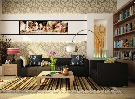 客廳中視聽(tīng)主題墻比較多見(jiàn)。由于它地處客廳的中心位置,因此也較容易成為人們視覺(jué)的聚焦點(diǎn),視聽(tīng)主題墻的設(shè)計(jì)應(yīng)在其空間功能的基礎(chǔ)上,根據(jù)其空白面積的多少進(jìn)行構(gòu)思。材料的使用可以是無(wú)限制的,但應(yīng)體現(xiàn)主人的個(gè)性,并把其獨(dú)特的品位引入其中。由于視覺(jué)的特殊功能,因此在視聽(tīng)設(shè)備的正后面,選擇吸音的材料會(huì)更好地體現(xiàn)它的功能性,如吸音好的地板、文理粗糙的壁紙、有肌理效果的石材或故意作出的粗糙墻面等。另外,運(yùn)用這樣的材質(zhì),還能在墻面上拼貼出異乎尋常的畫面效果,形成綜合的視覺(jué)回饋。但視聽(tīng)主題墻的設(shè)計(jì)要特別注意嚴(yán)整,避免零亂;其次色彩和材質(zhì)在保持新穎別致的同時(shí),也要注意不與整體的客廳環(huán)境相矛盾,除非你的墻面很小,可以被當(dāng)作展示個(gè)性的角落,否則越大的墻面,就越注意整體的和諧。