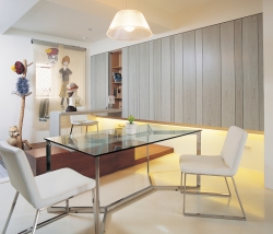 用于區(qū)隔不同空間的隔間墻,通常都是實體的,但是如果兩者空間并不需要太大的隱私,譬如廚房與走道、或是客廳與餐廳,則可以雙面透空以格狀柜體收納置物,雙面收納攻力加倍;或者隔間只是暗示性質(zhì),高度不高,則都可以兼具收納功能。