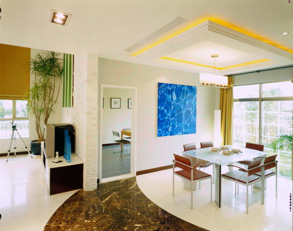 利用裝修手法區(qū)分:各個(gè)功能性分區(qū)都有它的主要功能,您可以利用獨(dú)特的裝修手法來區(qū)分它們。這種區(qū)分主要在吊頂上,如在整個(gè)大廳中可以做兩個(gè)局部的吊頂,在會客區(qū)上方安置一個(gè)吊頂,在餐廳上方再安排一個(gè)吊頂,這樣就自然形成了兩個(gè)區(qū)域。另外,還可以利用墻壁裝飾來區(qū)分空間。如在會客區(qū)中,視聽設(shè)備后的“文化石背景墻”就與餐廳的“固定式餐具柜”形成鮮明對比。