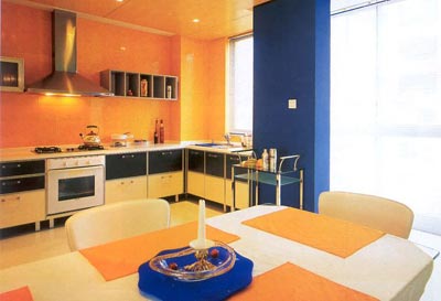 但在較年輕使用對(duì)象中,操作者一般都比較活潑,廚房家具的色彩可以使用比較熱烈活潑的原色,或明度與純度都比較高的其他色彩,如紅色、藍(lán)色、綠色等。對(duì)于絕大多數(shù)的廚房家具色調(diào)應(yīng)以柔和為主,不直接采用原色,或不宜采用被認(rèn)為是不干凈的色彩和不能刺激食欲的色彩。