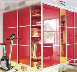衣柜采用最流行的紅顏色,紅色最能強(qiáng)烈表現(xiàn)并增強(qiáng)直線感和藝術(shù)感。這里使用的5扇滑動(dòng)門是背面涂了紅色漆的研磨玻璃。因?yàn)椴A芡腹?,所以衣帽間里不用準(zhǔn)備特別的燈光,借助臥室的燈就能把這個(gè)3.20米x2.80米的衣帽間內(nèi)部看得一清二楚。而衣帽間內(nèi)部則設(shè)計(jì)為井字結(jié)構(gòu)。