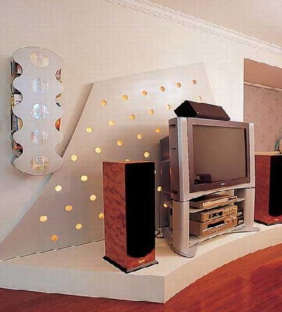 客廳是與客人交談的地方,一組沙發(fā)、茶幾,在功能上講也就足夠了。但客廳同時也是家人休閑相聚的場所,而目前大眾家庭娛樂的手段主要是看電視、看VCD、唱卡拉OK等,所以客廳中的電視墻便面了焦點,成了最能體現(xiàn)主人個性化的地方。