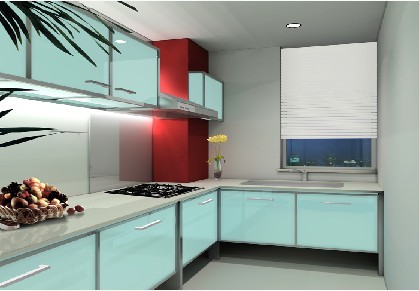 (2)L型:將清洗、配膳與烹調三大工作中心,依次配置于相互連接的L型墻壁空間。最好不要將L型的一面設計過長,以免降低工作效率,這種空間運用比較普遍、經濟。