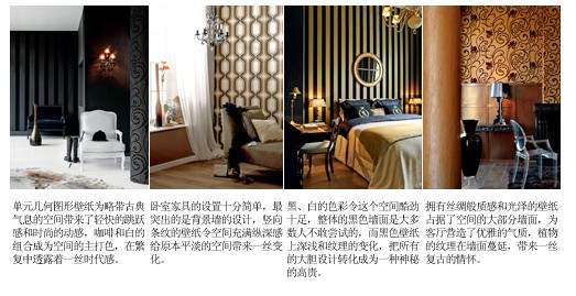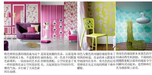 整體效果:壁紙的色彩十分廣泛,不同材質的壁紙可以產(chǎn)生不同的色彩氛圍和質感,紙基壁紙和PVC壁紙比較普遍,色彩眾多,容易清潔;而織物壁紙和植物壁紙在立體感的塑造上比紙基壁紙要略勝一籌,但是清潔起來比較麻煩,凹凸紋理的細節(jié)需要在保養(yǎng)上下一番工夫;其它的壁紙,如金屬壁紙、熒光壁紙可以產(chǎn)生一些特殊的效果來裝點房間。和絢麗色彩相映成趣的當然是壁紙上的圖案,最常見的使用方法是在整體氛圍確定后,以局部點綴一些帶有花紋的裝飾圖案,把人的視覺重點自然地過渡到帶有圖案的墻面上,令鮮亮的色彩和各種圖案完美地融合在一起。