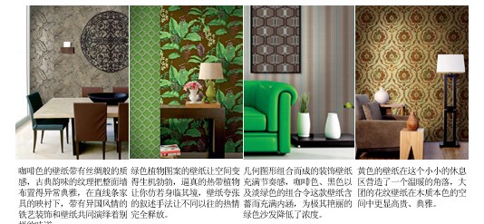整體效果:異域元素的壁紙在色彩上十分低調,通常最突出的表現(xiàn)是壁紙上帶有異國特色的紋理裝飾,不同的花紋能帶來不同國度的韻味,不同的植物更有不同地方區(qū)域的特點,用深色或者單一色彩打底才能凸現(xiàn)這些花紋帶來的異域風情,異域元素的出現(xiàn)可以恰到好處地安撫普通空間的過于平淡,也可以彰顯個性空間的獨特審美,為空間蓋上時尚的印章。與異域元素搭配的家具大多線條簡潔,在質感和細節(jié)的設計上卻有過人之處,精致和細膩的家具是異域風情最好的詮釋。