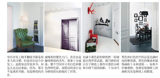 整體效果:充滿趣味效果的壁紙總是能讓你在恍然大悟之后,報以會心的一笑,它們可以出現(xiàn)在你不經(jīng)意的每個空間,在你沒有發(fā)現(xiàn)的時候,根本體會不到它的特別,一旦被你識破了其中的端倪,壁紙的趣味必然會被你樂意拿來炫耀,一扇虛掩著的大門,真的走向它你才會發(fā)現(xiàn),這是一張鋪滿了壁紙的墻壁,壁紙逼真的效果令所有人驚訝,想要讓壁紙的趣味性發(fā)揮到極致,一定要在家具和色彩上與壁紙統(tǒng)一,才能達到配合壁紙的最佳效果,或者把家具精簡到少之又少,令所有的焦點都集中在壁紙,以凸現(xiàn)壁紙的趣味設計。