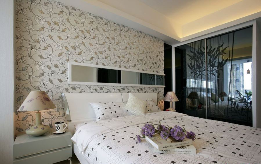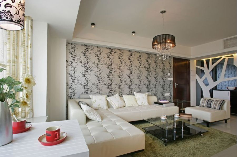時(shí)尚的沙發(fā)背后是黑白銀花卉韓國(guó)壁紙,詮釋了現(xiàn)代年輕人對(duì)時(shí)尚的熱衷與追求。