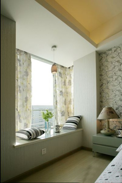 設(shè)計(jì)師巧妙地利用臥室的大飄窗,配上白色的休閑臺(tái)和淡綠花卉窗紗。