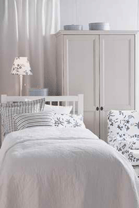 經(jīng)典的灰白搭配,也是張單人床哦。有意思的是床品,椅子和燈飾的花紋都是相互呼應(yīng)的呢。海裝潢網(wǎng)