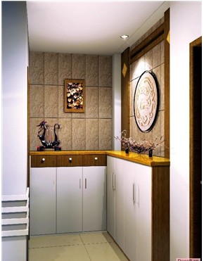 玄關空間形態(tài)有時被稱為灰空間,它與客廳等其它空間的界定有時很模糊,因此,在設計時有時需要設計一處隔斷,既有界定空間,緩沖視線的作用,同時又具有畫龍點睛的裝飾作用。人們在日常生活中所指的狹義的玄關就是此類隔斷。