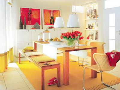 餐廳以紅、黃、白做主打,白色做過渡,把紅**和黃色搭配的很漂亮。餐廳墻壁做了白色實(shí)用型的柜子,在柜子上擺放了紅色及綠色的裝飾品,單調(diào)的感覺一下子就不見了。餐桌的兩邊擺放了不樣的椅子,一邊擺放了長方型的椅子很實(shí)用,人多可以擠一擠。另一邊則擺放了藝術(shù)造型的椅子,整體設(shè)計(jì)的很別致。
