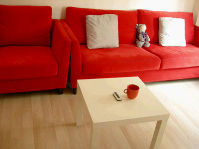 客廳,紅色的沙發(fā),紅色的杯子,以及沙發(fā)上簡(jiǎn)單的靠墊以及玩具,這里的每一樣家具和擺設(shè)都是家具店里最常見(jiàn)的,可是,當(dāng)他們放在一起,時(shí)尚、舒適又有幾份愜意在不經(jīng)意中彌漫。