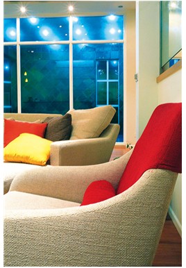 按常規(guī)來說,無論是傳統(tǒng)風(fēng)格中的東方形式還是西方形式,家具、門窗的顏色搭配都以深色為主,但現(xiàn)代時尚風(fēng)格的居室中的用色越來越大膽、奔放,比如這套由龍發(fā)設(shè)計師創(chuàng)作的前衛(wèi)派作品,其大紅大綠的搭配,令人耳目一新。設(shè)計手法是簡潔、明了,拋棄眾多繁瑣設(shè)計,注重空間色彩及結(jié)構(gòu)的挖掘。綠色調(diào)整面墻的造型書架和橙色墻面,配以異形吊燈,讓這個空間充滿了幾分靈性,原本寧靜的地方變得“熱鬧”了起來,別有一番情趣。