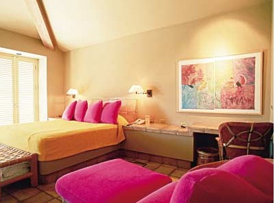 在色輪上找一個你最有感覺的紫色,那么與它相鄰的紫紅色和藍紫色都是它的協(xié)調(diào)色。如果再加上這三個顏色還有不同深淺的明度,你就可以在眾多協(xié)調(diào)色中找到最舒服的方案。在這個方案里,屬于基礎(chǔ)部分的墻壁、床蓋和靠枕都是紫色,只不過明度都很淺。而布藝床頭和長毛批毯分別是紫紅色和藍紫色。當(dāng)大的用色環(huán)境被定格后,那些條紋靠墊,裝飾畫和花瓶等各種用品都會圍繞這個原則,深深淺淺地穿插在各個角落里。