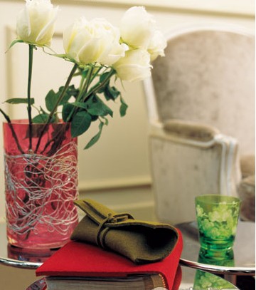 玫紅色的玻璃花瓶上金屬絲錯(cuò)落盤繞,將白玫瑰映襯得格外浪漫,綠色印花水杯更顯得清新可人,紅與綠搭配出動(dòng)人的和諧。