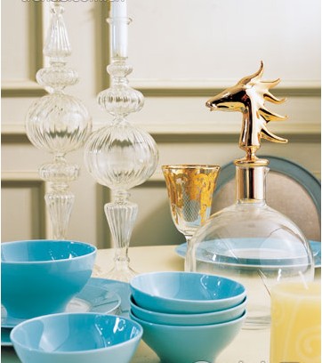 古典餐桌的現(xiàn)代式優(yōu)雅  餐桌的線條帶著鮮明的復(fù)古風(fēng)潮,在背景墻的襯托下有種歲月沉淀的優(yōu)雅韻味?;野椎闹魃{(diào)也給餐桌布置上留下更多揮霍色彩的空間。天空一般純凈的藍(lán)色餐具,嬌嫩的花朵搭配細(xì)頸寬口花瓶,華貴的金色酒杯以及晶瑩剔透的燭臺(tái),讓古典餐桌霎時(shí)渲染上現(xiàn)代式的優(yōu)雅。顏色純美干凈的餐具會(huì)讓人有種想品嘗美食的沖動(dòng),為了營(yíng)造更加純凈的氛圍,燭臺(tái)、酒杯與酒瓶都選擇無(wú)色透明的玻璃材質(zhì),而一點(diǎn)金色的點(diǎn)綴更增添了一份高貴氣質(zhì)。
