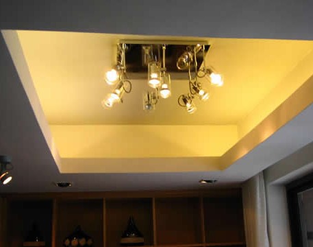 現(xiàn)代住宅普遍層高都在2.8米左右,如果客廳屋頂再采用造型天花來裝飾,就會(huì)因屋頂壓得太低而讓人有強(qiáng)烈的壓迫感。對(duì)于這種情況,可采用四邊低而中間高的天花造型,這樣一來,不但視覺上較為舒服,而且天花板中間的凹位形成聚水的“天池”,對(duì)住宅大有裨益。若再在聚水的“天池”中央懸掛一盞金碧輝煌的水晶燈,則會(huì)有畫龍點(diǎn)睛之效,但切勿在天花板上裝鏡。另外,吊燈也不宜有尖銳的形狀。