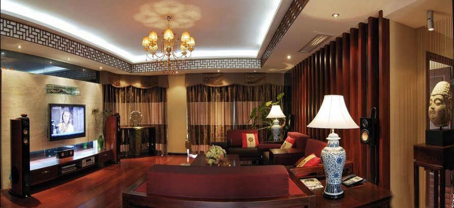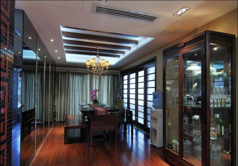 整個客廳的家具擺設(shè)都以中式風(fēng)格為主,古色古香。餐桌上方的吊燈確是歐式風(fēng)格,現(xiàn)代感體現(xiàn)。