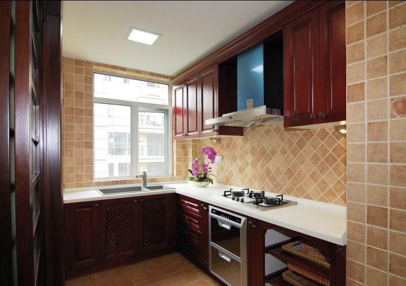 中式裝修的廚房,墻面磚是歐式風(fēng)格的,櫥柜確依然古色古香。