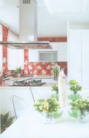不規(guī)則的紅色花磚組合是這個(gè)與小餐廳相連的開(kāi)放式廚房的亮點(diǎn),也成為客廳、廚房之間的自然過(guò)渡。