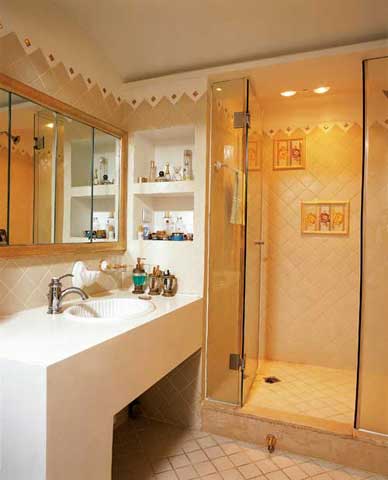 最值得玩味的是,各種花朵元素被精心安排在各處,巧妙地呼應(yīng)著居室的主題。同樣的藍(lán)色壁紙上對比運(yùn)用了田園風(fēng)格的枝葉繁茂的大團(tuán)花與清新簡潔的小碎花;白色的書柜特意選擇了無背板的設(shè)計,可以透露出壁紙的花色,在細(xì)節(jié)的微小之處更體現(xiàn)了空間延伸的概念;鵝黃紗幔上的淡雅提花和白底沙發(fā)上的紅、藍(lán)花朵又與房間主色和諧一致;甚至在浴室的墻面和門上都不忘裝飾上花朵元素;更有花瓶中絢爛的藍(lán)、白花卉點(diǎn)綴其中,營造出猶如夢幻般的私家花園的居室,一切都令人感覺那么愜意、愉悅。